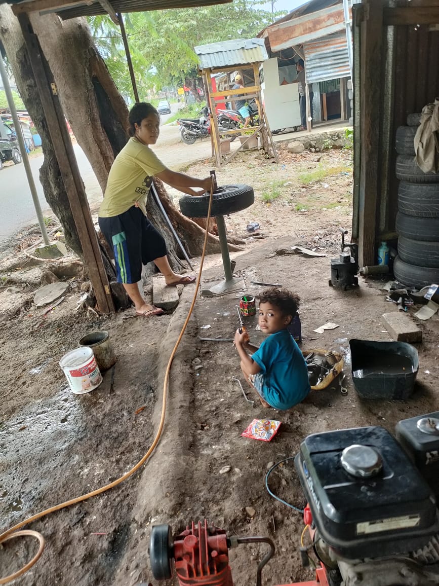 Dengan rautnya yang ramah, melayani setiap pengendara mobil atau sepeda motor yang bank kempes atau pecah. Membantu kedua orangtuanya Aris Leo dan Hasni Nuban di gerbang masuk Pasar BTN Kolhua.