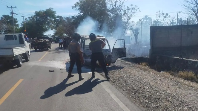 Kapolres Kupang AKBP FX Irwan Arianto, SIK MH yang dikonfirmasi Senin 15 Agustus 2022 petang membenarkan terjadi kecelakaan lalu lintas berupa terbakarnya satu unit mobil mikrolet dan tidak ada korban jiwa ini