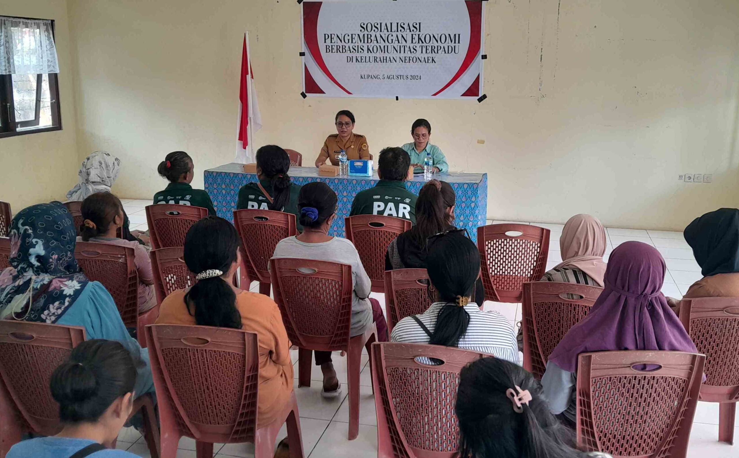 Kegiatan Sosialisasi Pengembangan Ekonomi Berbasis Komunitas Terpadu di Kelurahan Nefonaek, dihadiri dan dibuka oleh Lurah Nefonaek, Josephina Ungirwalu.