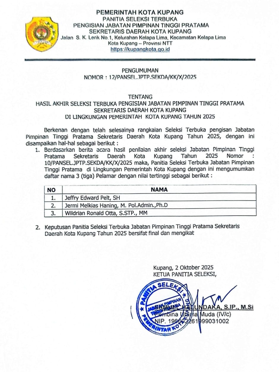 Pengumuman itu disampaikan Pansel melalui surat yang dikeluarkan, Kamis, 2 Oktober 2025 dan ditandatangani oleh Ketua Pansel JPTP Sekda Kota Kupang, Samuel Halundaka.