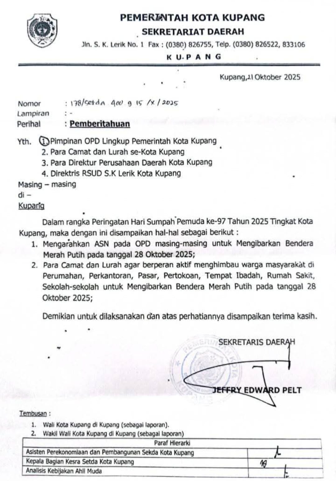 Surat itu juga mengarahkan para lurah dan camat se-Kota Kupang untuk mengimbau warga di perumahan, perkantoran hingga pasar untuk mengibarkan bendera merah putih di hari peringatan Sumpah Pemuda yang ke-97 tahun 2025.