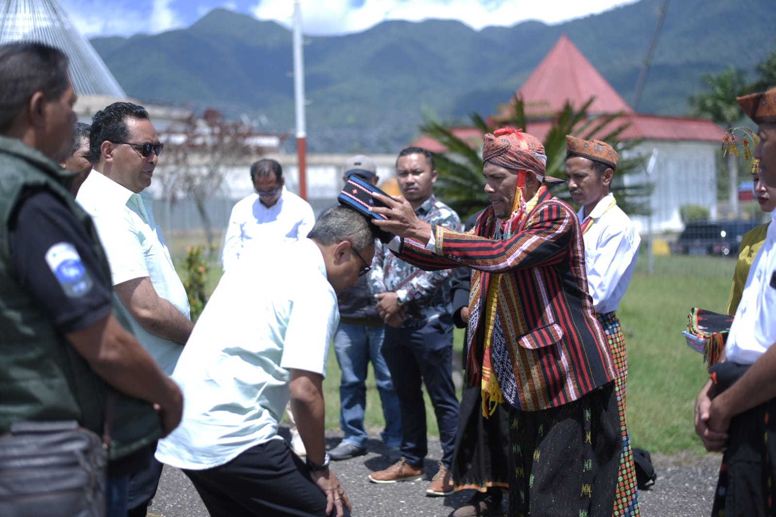 Simon Petrus Kamlasi dipakaikan Rea Songke yang merupakan songko khas Manggarai di atas kepalanya.