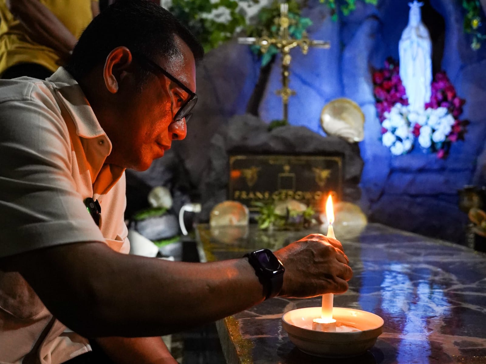 Dalam ziarahnya, Ansy Lema membakar lilin dan berdoa ditemani istrinya, Maria Immaculata Inge Nioty bersama para relawan, dan para kader partai.