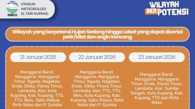 EXPONTT.COM, KUPANG – Badan Meteorologi Klimatologi dan Geofisika (BMKG) El Tari Kupang mengeluarkan peringatan dini terkait cuaca di wilayah Nusa Tenggara Timur (NTT) 22 hingga 23 Januari 2026. BMKG menyebut…
