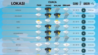 EXPONTT.COM, KUPANG – Badan Meteorologi Klimatologi dan Geofisika (BMKG) mengeluarkan prakiraan cuaca di wilayah Nusa Tenggara Timur (NTT) untuk Sabtu, 14 Februari 2026 BMKG memprakirakan wilayah Pulau Timor bakal dilanda…